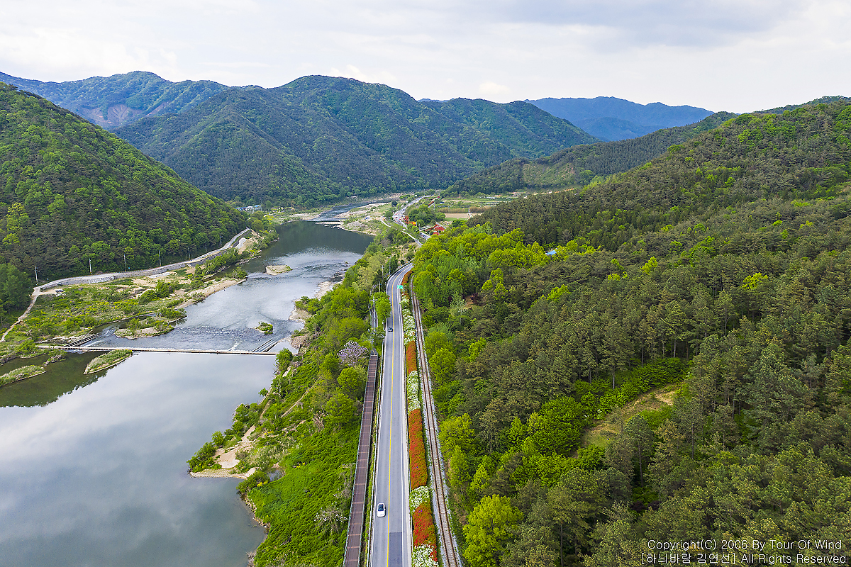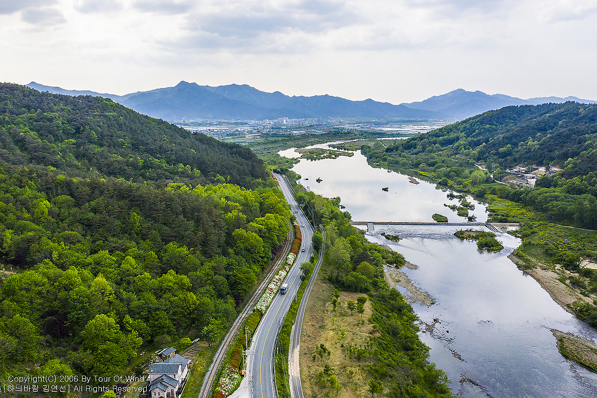 길은 강과 산 사이로 이어집니다.
