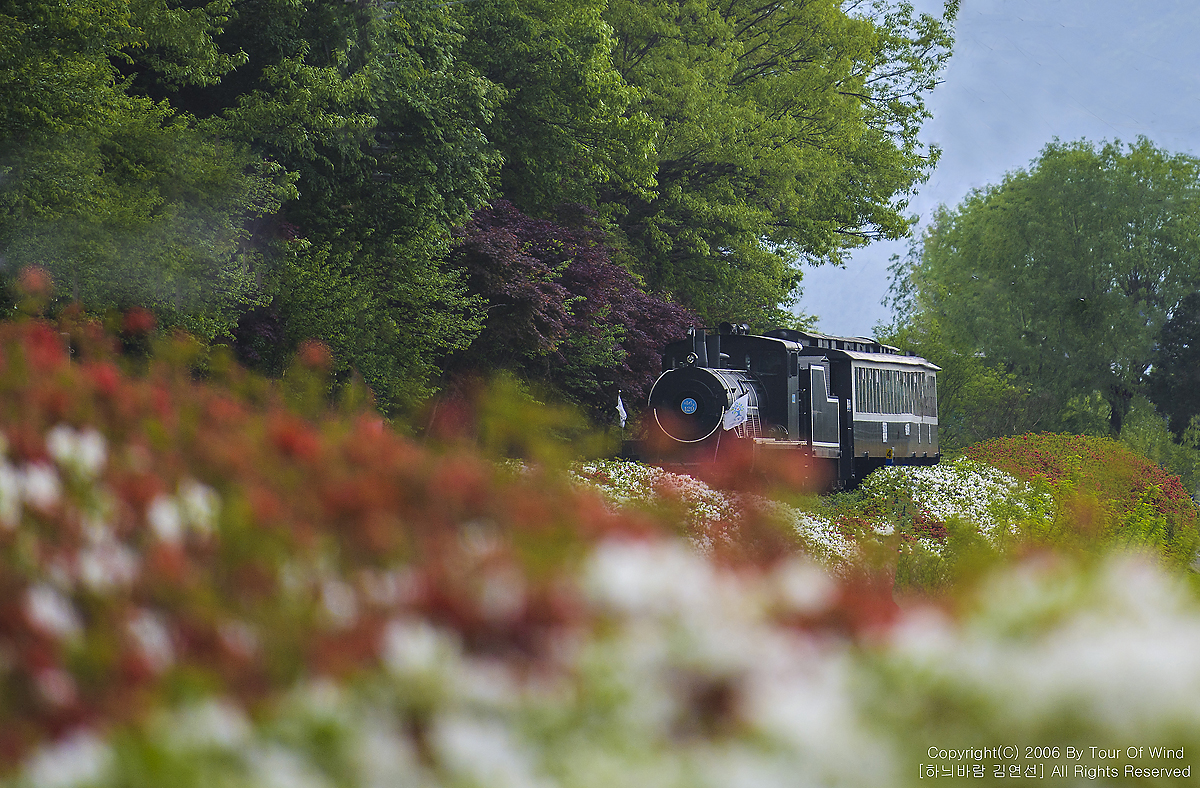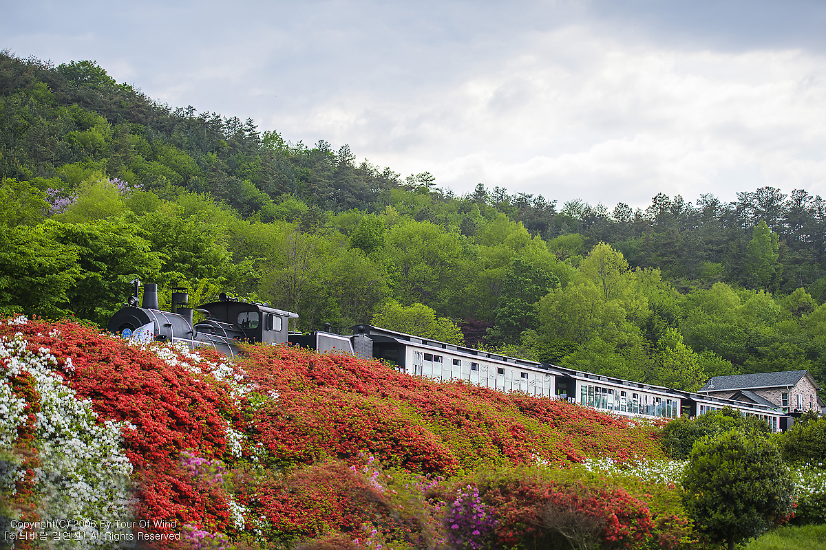 한쪽에는 풍성한 철쭉꽃들이 철길을 따라 이어집니다.