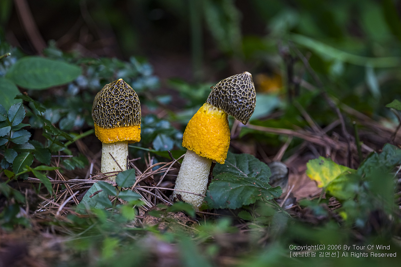 두 송이 노랑망태버섯이 고개를 내밀었습니다
